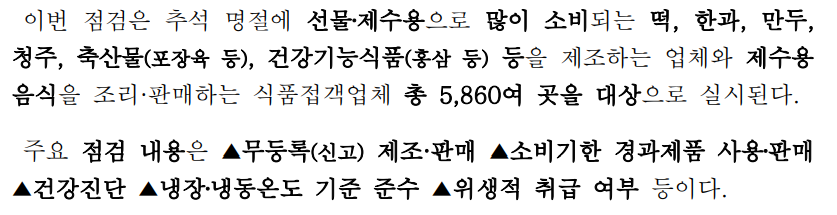 이번 점검은 추석 명절에 선물‧제수용으로 많이 소비되는 떡, 한과, 만두, 청주, 축산물(포장육 등), 건강기능식품(홍삼 등) 등을 제조하는 업체와 제수용 음식을 조리·판매하는 식품접객업체 총 5,860여 곳을 대상으로 실시됩니다.