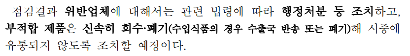 점검결과 위반업체에 대해서는 관련 법령에 따라 행정처분 등 조치하고, 부적합 제품은 신속히 회수·폐기(수입식품의 경우 수출국 반송 또는 폐기)해 시중에 유통되지 않도록 조치할 예정입니다.