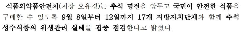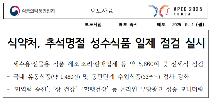 식품의약품안전처(처장 오유경)는 추석 명절을 앞두고 국민이 안전한 식품을 구매할 수 있도록 9월 8일부터 12일까지 17개 지방자치단체와 함께 추석 성수식품의 위생관리 실태를 집중 점검한다고 밝혔습니다.