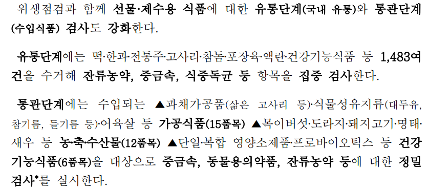 그리고 유통단계에는 떡‧한과‧전통주‧고사리‧참돔‧포장육‧액란‧건강기능식품 등 1,483여건을 수거해 잔류농약, 중금속, 식중독균 등 항목을 집중 검사할 예정입니다.