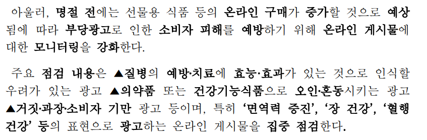 아울러, 명절 전에는 선물용 식품 등의 온라인 구매가 증가할 것으로 예상됨에 따라 부당광고로 인한 소비자 피해를 예방하기 위해 온라인 게시물에 대한 모니터링을 강화합니다.