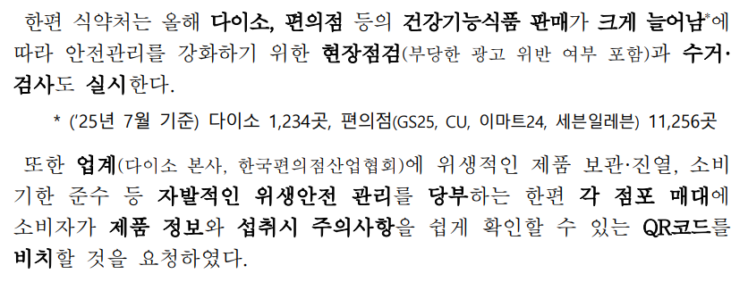식약처는 올해 다이소, 편의점 등의 건강기능식품 판매가 크게 늘어남*에 따라 안전관리를 강화하기 위한 현장점검(부당한 광고 위반 여부 포함)과 수거·검사도 실시할 계획입니다.