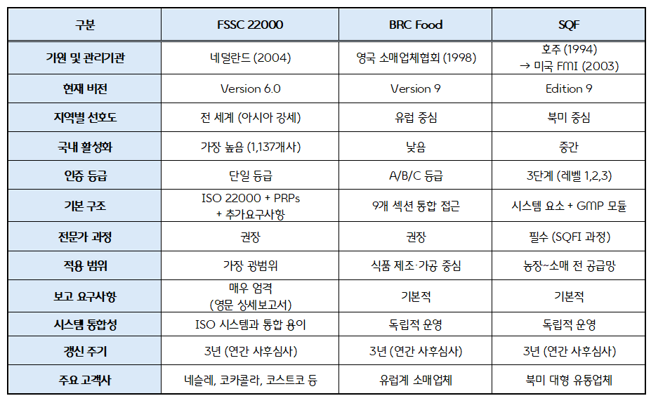 FSSC 22000, BRC Food, SQF는 모두 GFSI(Global Food Safety Initiative)에서 승인된 식품안전경영인증 입니다.
